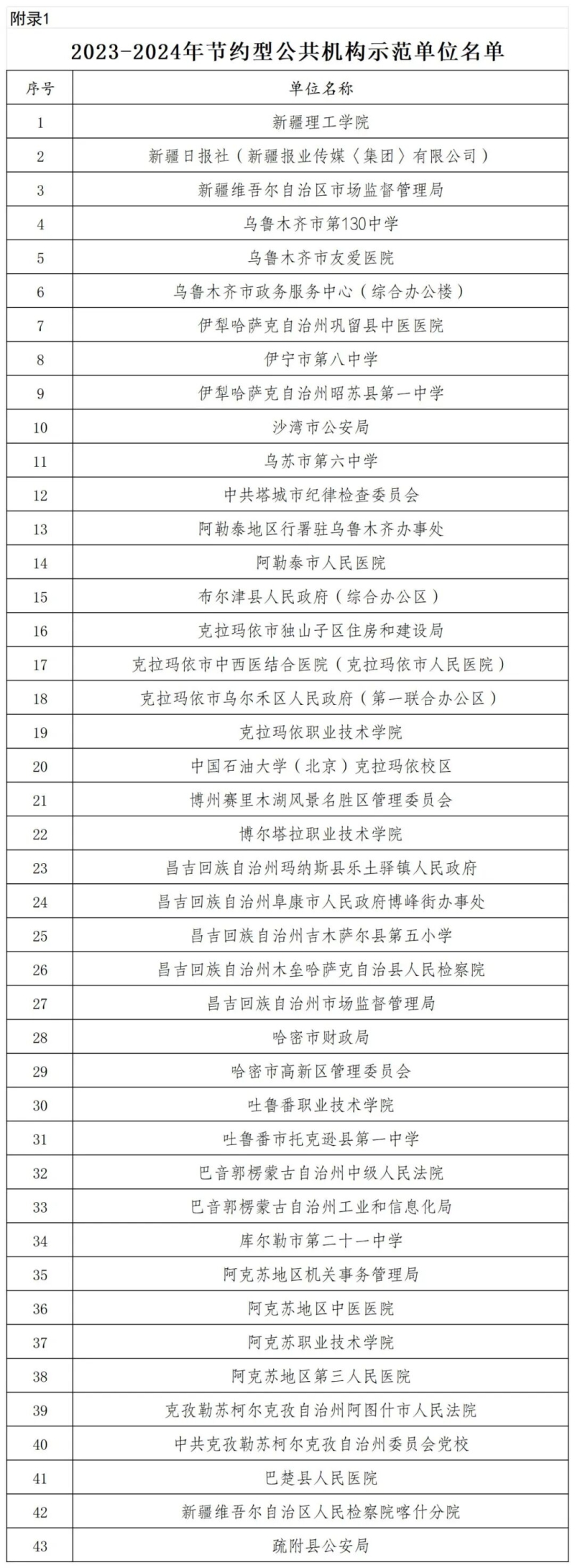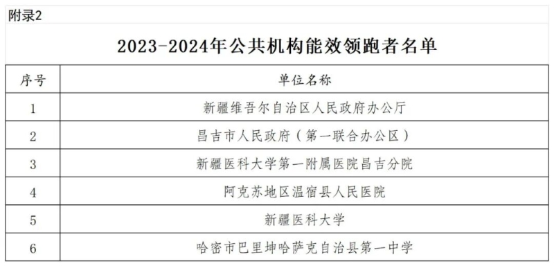 新疆理工学院、新疆日报社(新疆报业传媒<集团>有限公司)、自治区市场监督管理局等43家单位获评“节约型公共机构示范单位”,自治区人民政府办公厅、昌吉市人民政府(第一联合办公区)、新疆医科大学第一附属医院昌吉分院等6家单位获评“公共机构能效领跑者”。