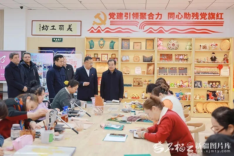 12月30日,自治区党委书记陈小江在自治区残联,听取残疾人就业创业情况介绍,察看残疾人制作手工艺品、非遗产品等。石榴云/新疆日报记者崔志坚摄